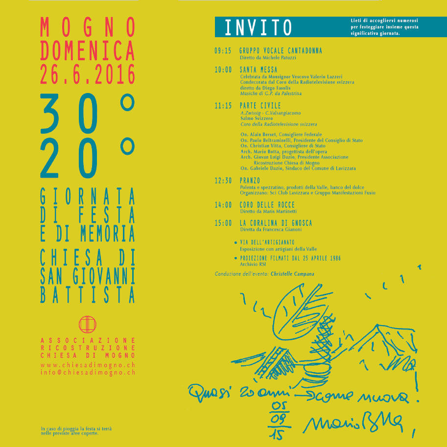 30. Gedenktag zum Lawinenniedergang (25.April 1986) und 20. Jahrestag der Weihung der neuen Kirche von Mogno (26.Juni 1996).