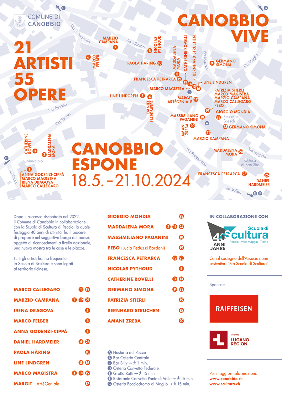Zusammen mit der Kunstkommission der Gemeinde Canobbio wurde eine Jury eingesetzt, die aus einer Vielzahl von Bewerbungen 21 Kunstschaffende ausgewählt hat. 55 Werke werden ausgestellt: Skulpturen und Installationen aus Marmor, Stein, Holz, Metall, Papier sowie Zeichnungen.