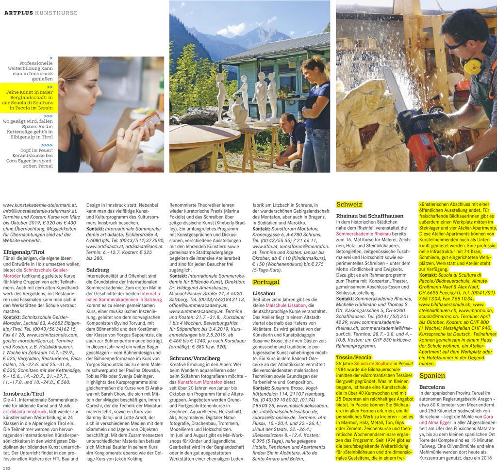 In der Februar-Ausgabe des Kunstmagazins ART wird die Scuola di Scultura unter den internationalen Sommerakademien empfohlen.