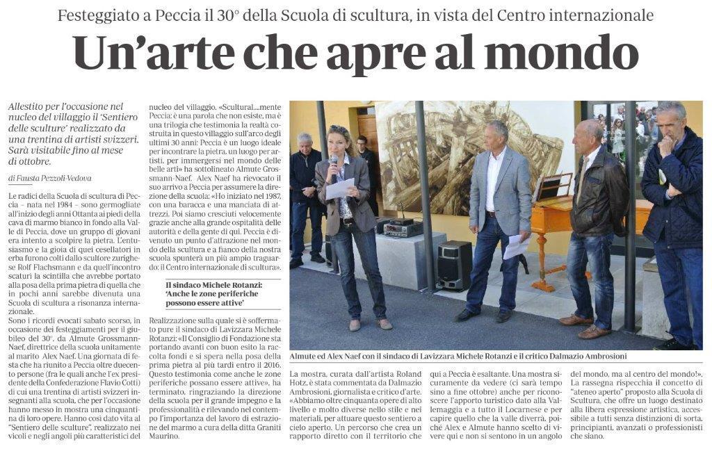 "Un'arte che apre al mondo" titelt die Zeitung "LaRegione" und berichtet über Vernissage und Ausstellung in Peccia.